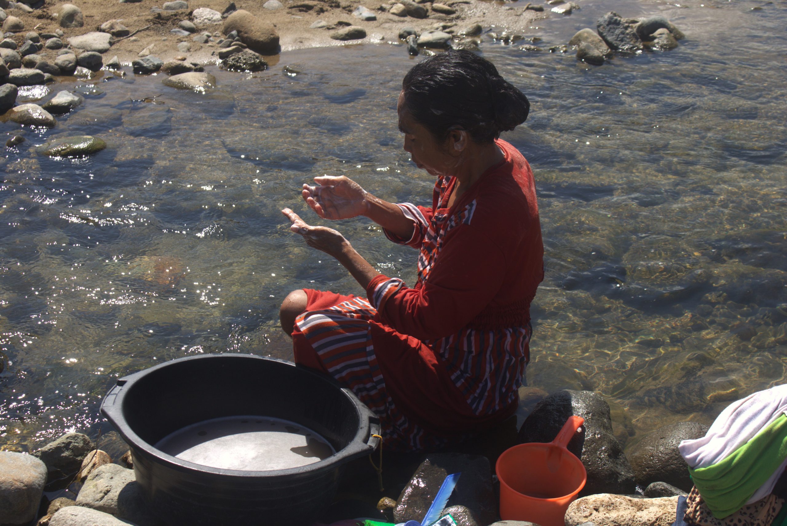 Warga memanfaatkan air Sungai Mongilo selebar sekitar dua meter untuk mandi dan mencuci, sumur di rumahnya mengering. Minggu 19 Oktober 2025 (Foto: Fara)